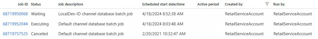 Go to AX and change the status of the latest ‘Default channel database batch job’ batch job created by RetailServiceAccount. This job will initially be in the canceled status.