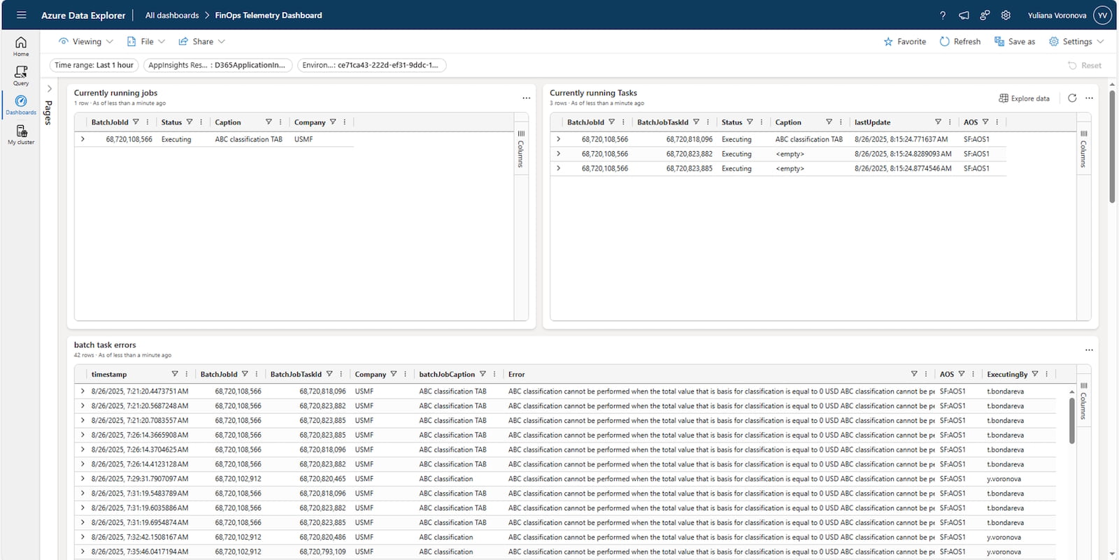 Azure Application Insights offers full visibility into batch jobs in Microsoft Dynamics 365 Finance & Operations (D365FO). It shows active tasks, errors, and workload distribution across AOS instances.