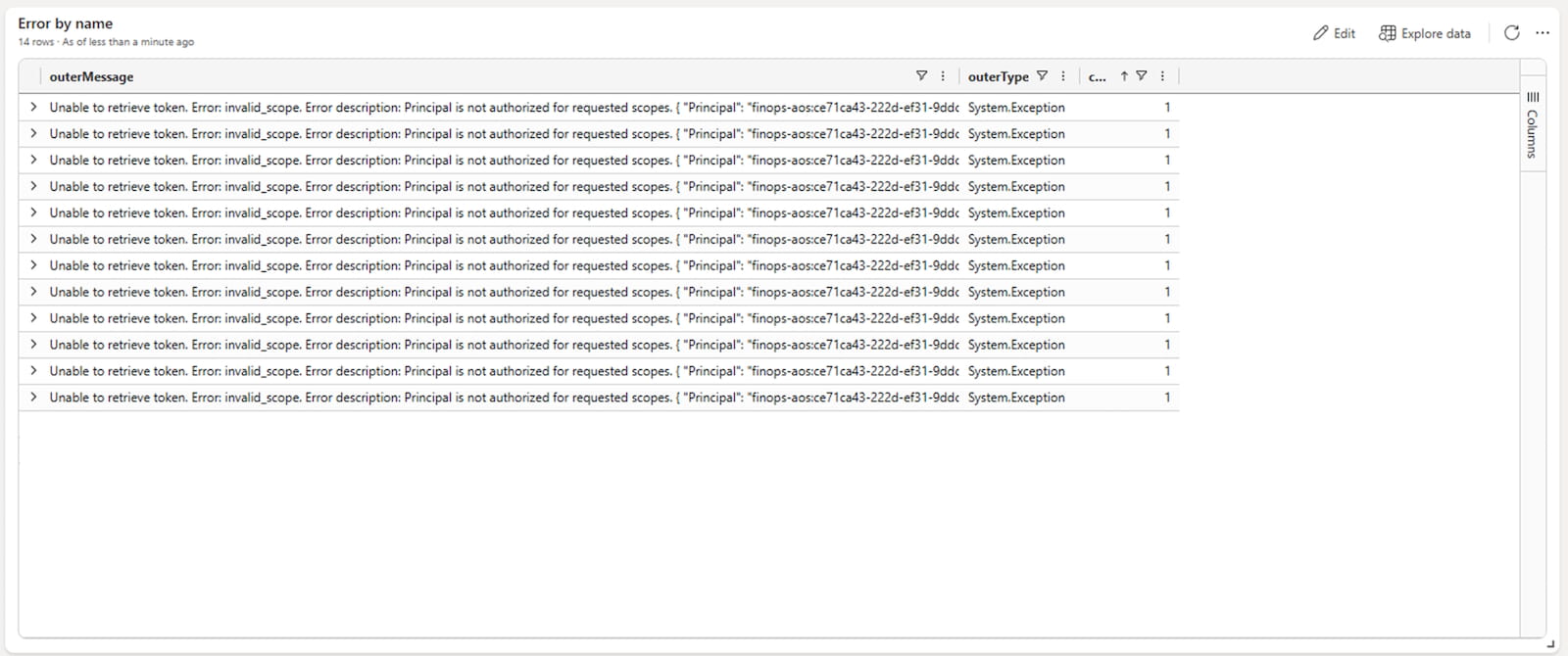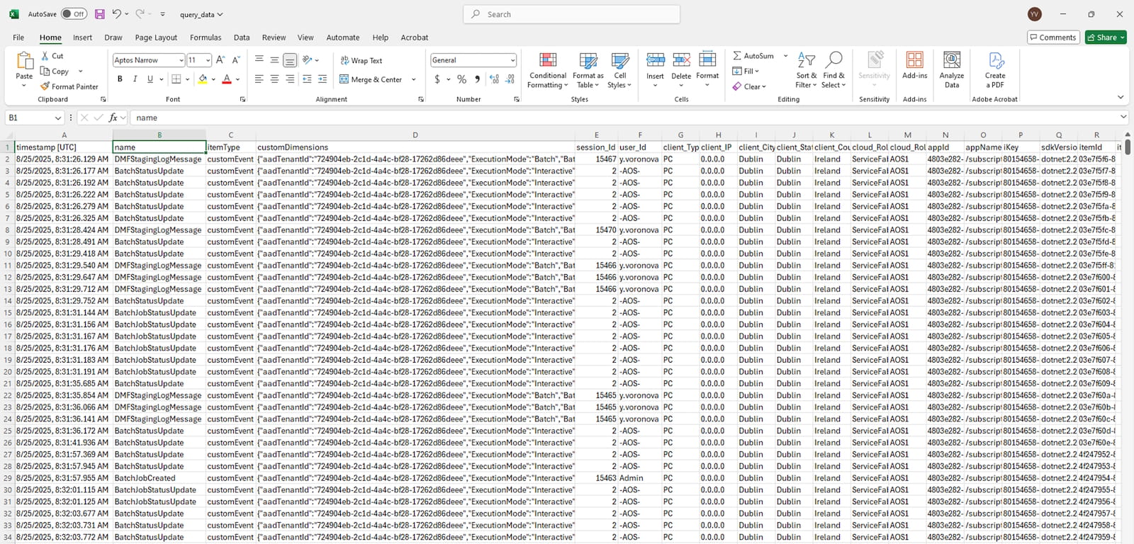 It is worth noting that in addition to batch execution analytics, Azure Application Insights also logs X++ Exceptions, DMF Errors, and other events, providing details about the location of the error, the user, and the time: