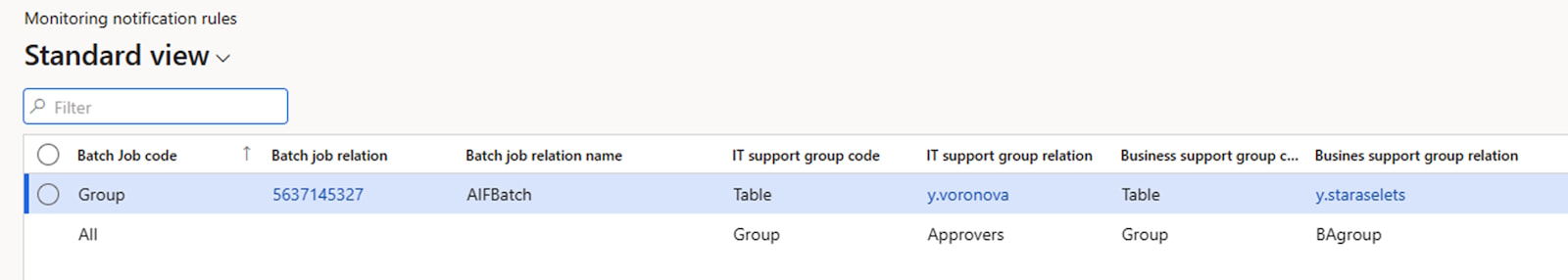 [ICS] Monitoring Tool can be easily adapted to your tasks: you can configure monitoring for specific batch jobs, error classifications, or alert parameters. You can also designate specific users or user groups (IT department and Business users) who should receive error notifications. All these configurations are set up on special dashboards in D365FO:
