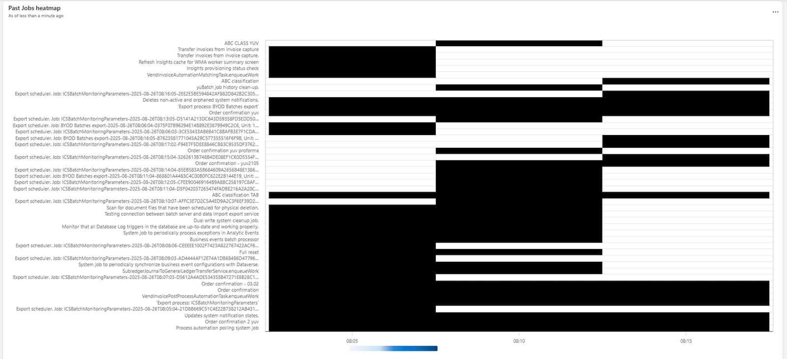 | Limitations: ⚠️ Tracks only jobs with “error” status ❌️ Batch jobs with Infolog warnings/errors, long execution times, untimely launches, etc. are not automatically tracked and must be tracked manually ❌️ No root cause analysis or resolution guidance ⚠️ Alerts are limited to standard events and may cost extra (depending on the plan you buy from Microsoft) ❌️ No statistics on batch job errors, their occurrence and resolution times ⚠️ Analysis of visual graphs (such as heatmaps) over a long period (>4 hours) is difficult, as the data is displayed in an unreadable format |