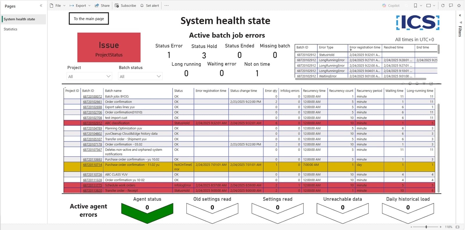 A Power BI dashboard called “Project health statistics” shows the current state of the system and active errors. It also allows you to analyse the history of these errors, identify recurring problems, and predict potential failures.
