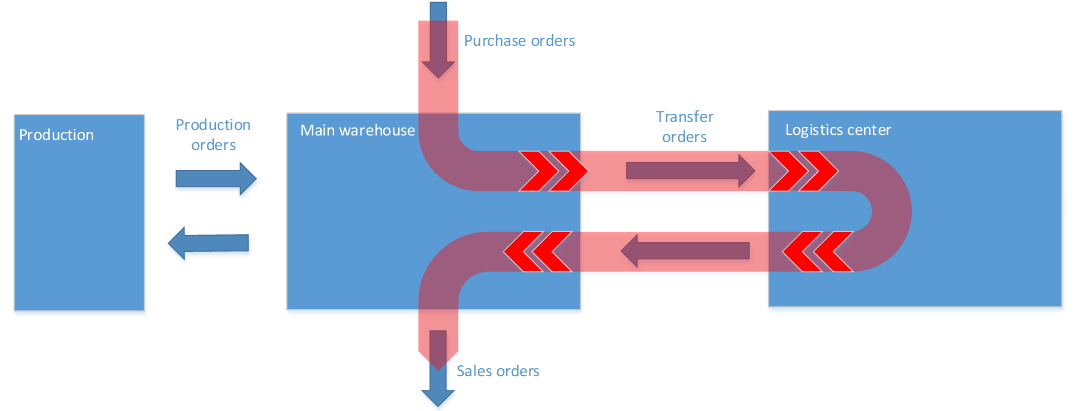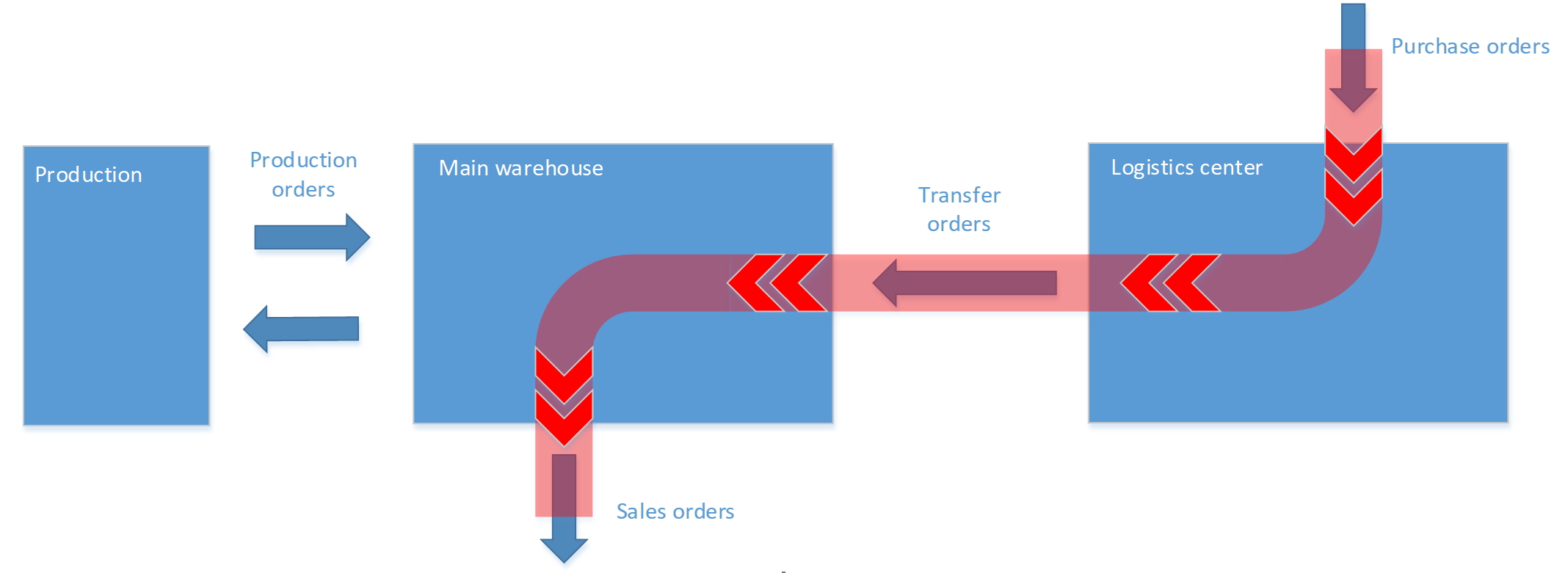 In the Direct scheme, we use the logistics center warehouse as part of the direct material flow. All incomings are received in the logistics center, after which the main warehouse can be filled from the logistics center. This scheme is simplest for realization in the standard functionality of D365FO. We can use Master Planning (MRP) for this scheme and the process can be fully automated. Unfortunately, this scheme implies that MRP will plan all purchases for the logistics center. However, if necessary, the user can generate purchase orders manually.