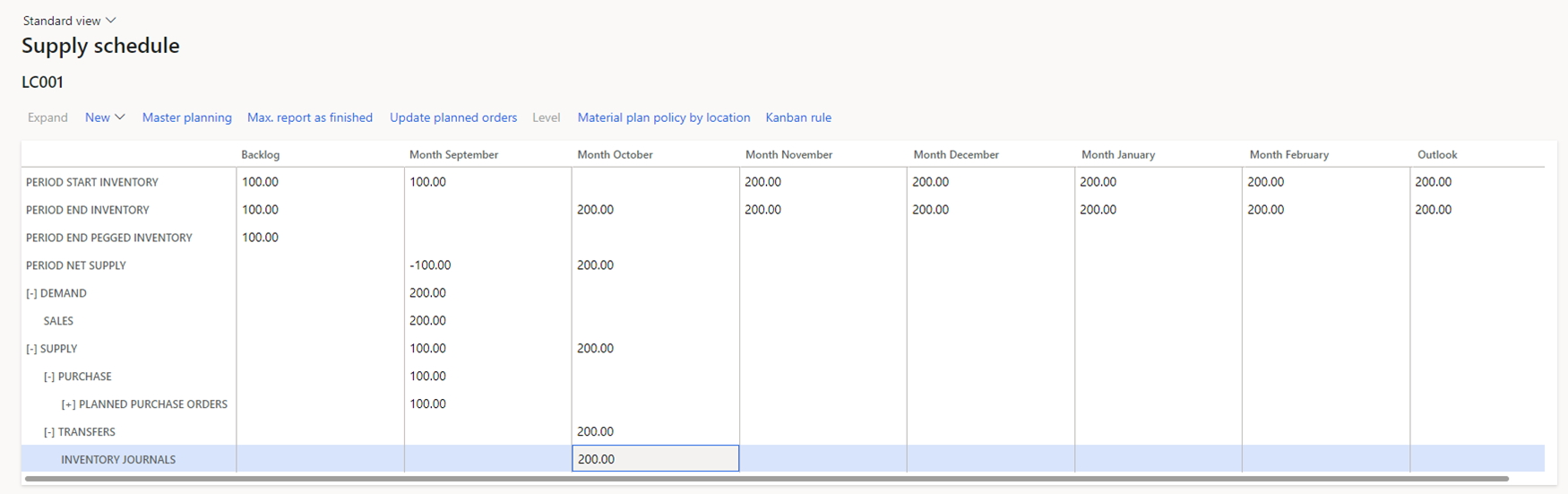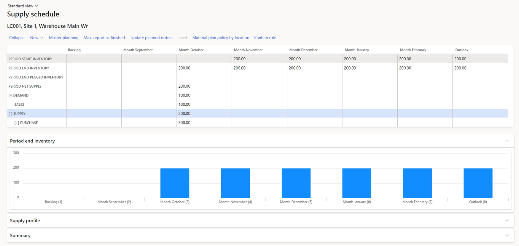 After this, the user should check the supply schedule and find surpluses. This can be done in the Supply schedule form. If we see any additional quantity at the end of the next period, it means that this quantity can be moved to the logistics center. See an example below: