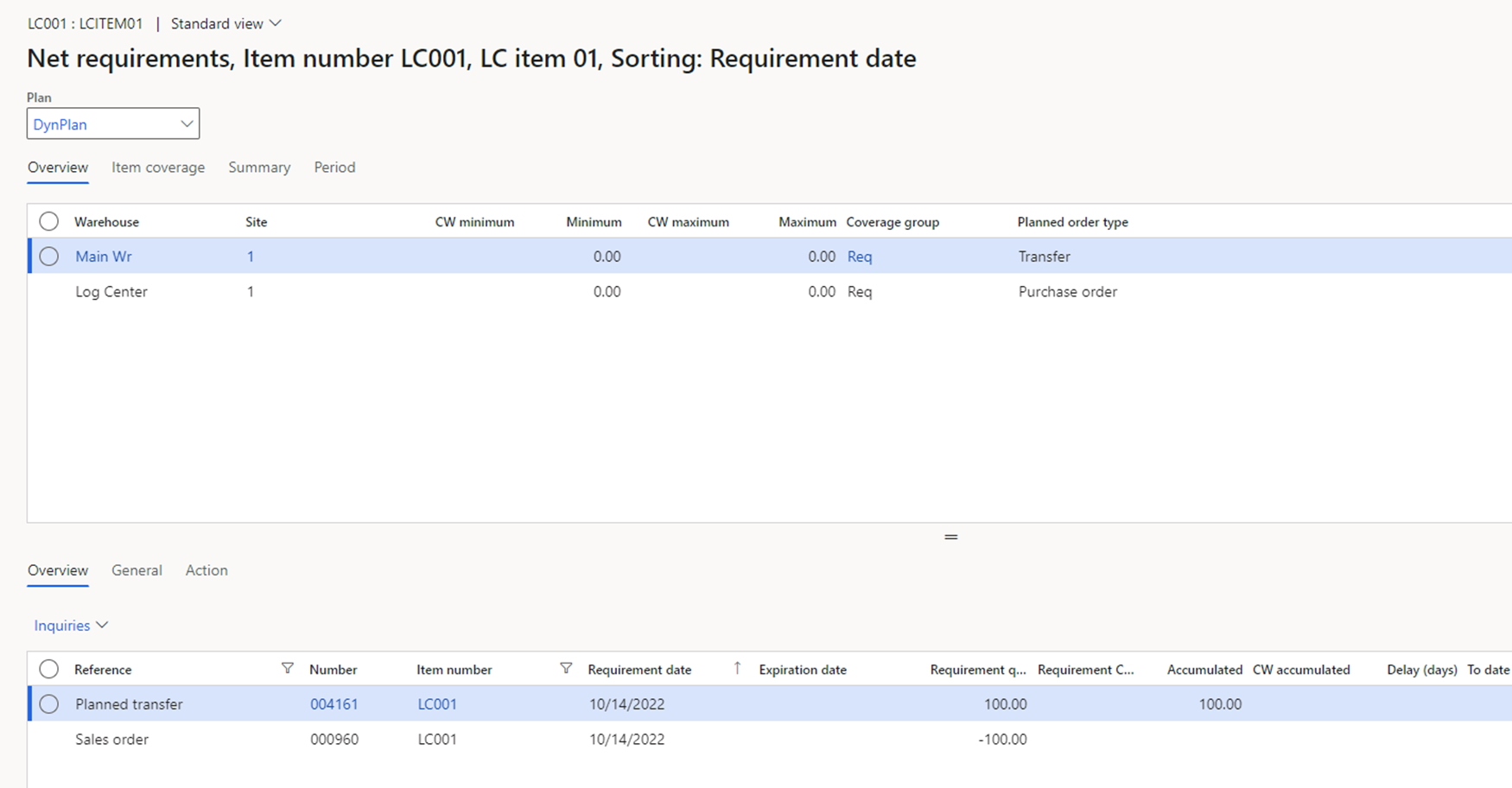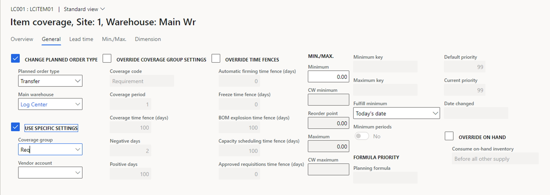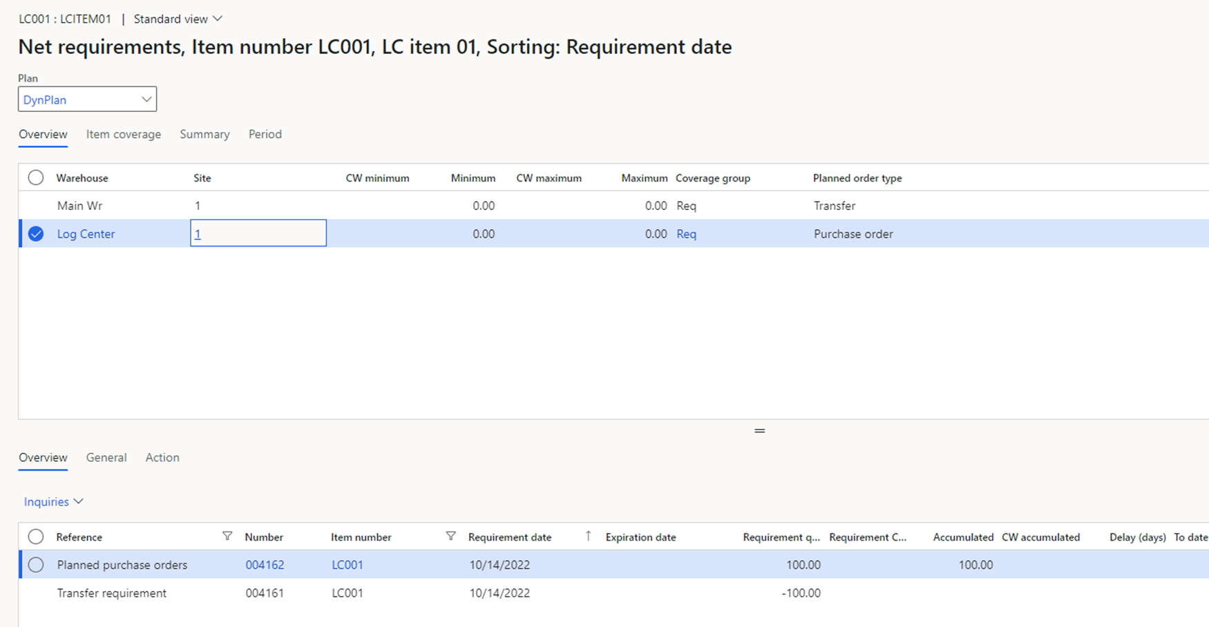 As we saw in the previous case, the planned purchases will be generated automatically without the special item coverage group. Additionally, the user can make the transfer planning to the logistics center a little bit easier. For this, the item should contain the item coverage group for the warehouse of the logistics center. This is shown below.