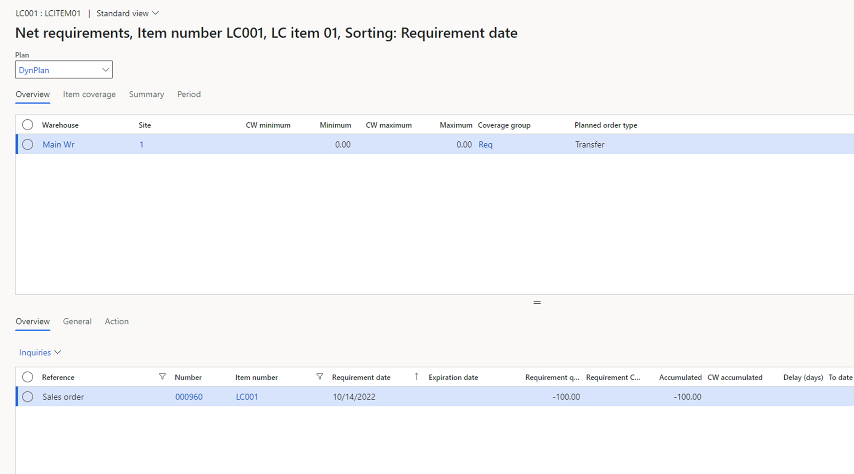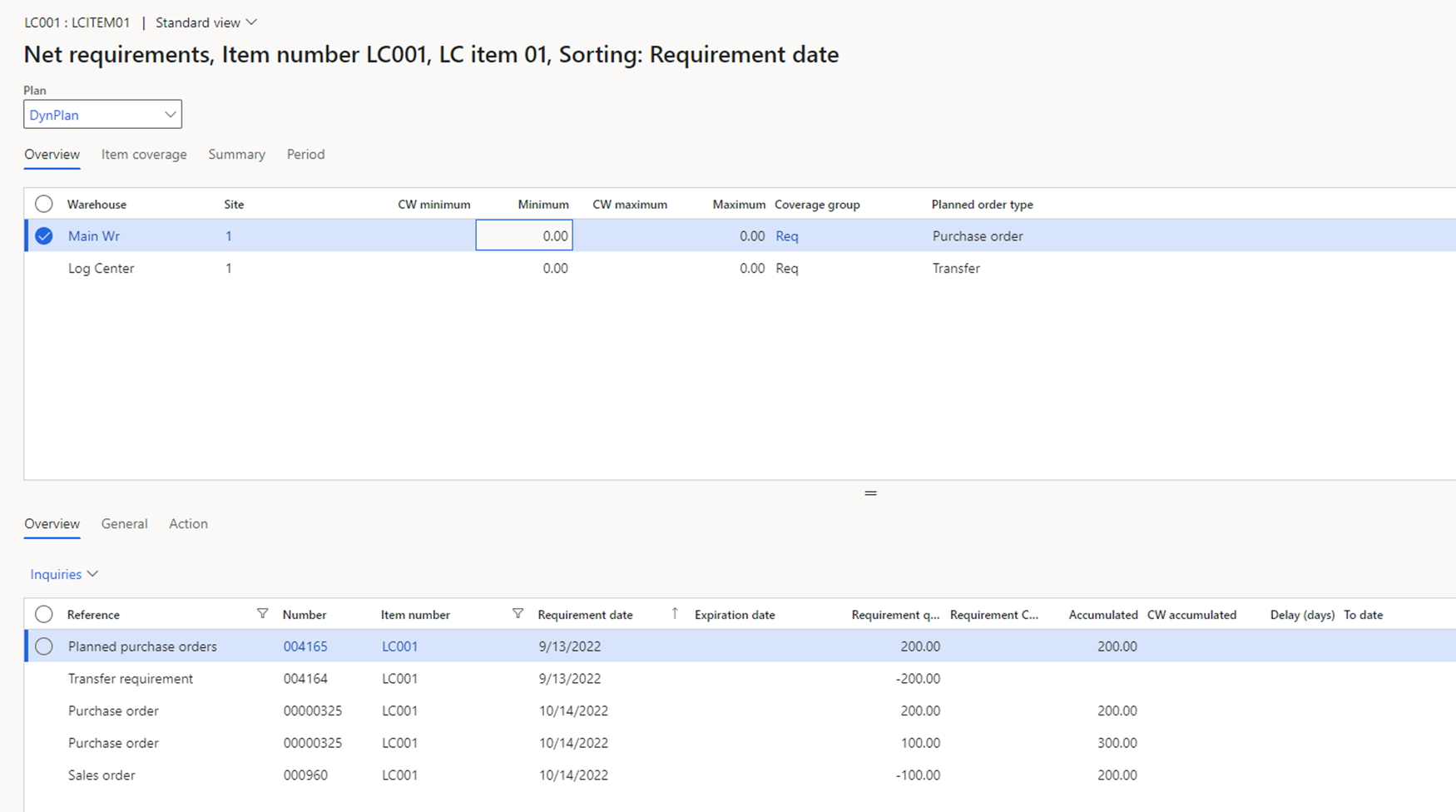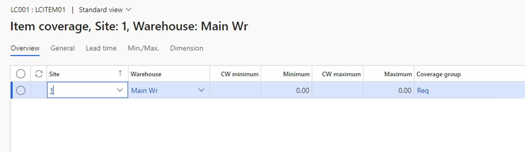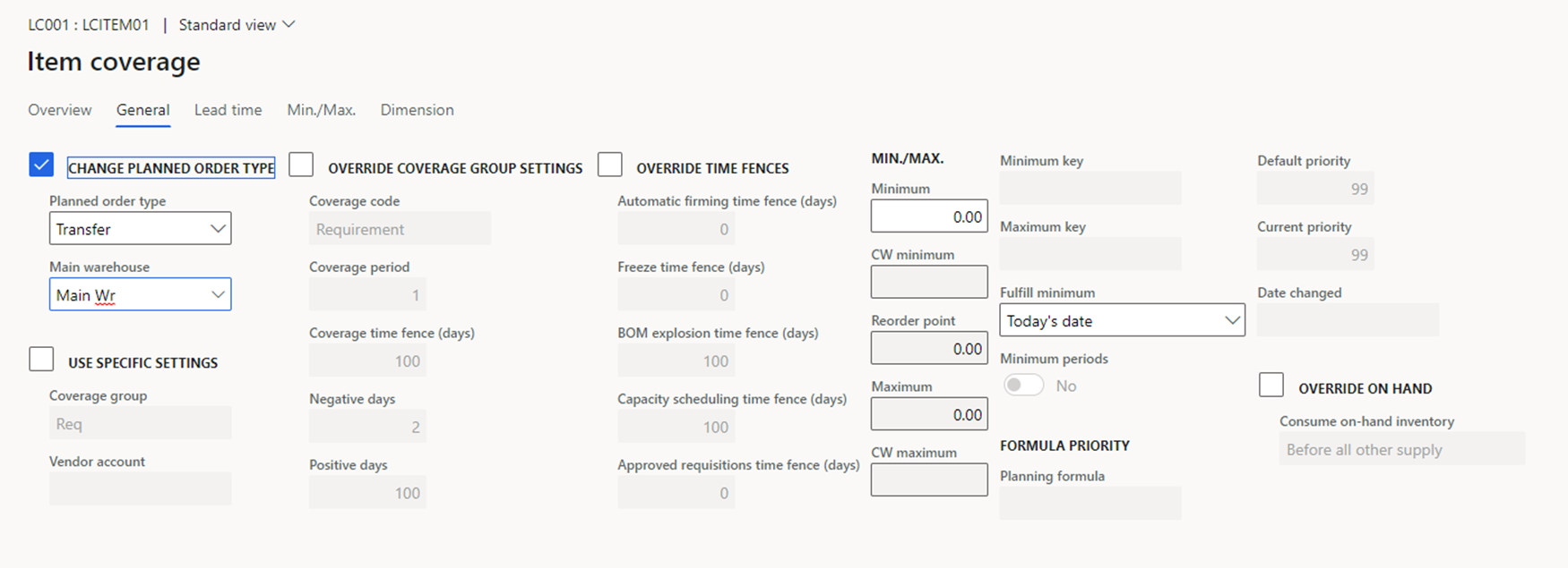 As we saw in the previous case, the planned purchases will be generated automatically without the special item coverage group. Additionally, the user can make the transfer planning to the logistics center a little bit easier. For this, the item should contain the item coverage group for the warehouse of the logistics center. This is shown below.