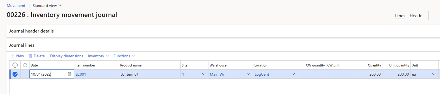 Unfortunately, after the transportation we will have a problem during the next MRP run. MRP will not find the availability in the main warehouse and will generate a new purchase order according to the coverage group. To avoid this, we need to order all availability of the logistics center to the main warehouse. The movement journal with a special “logistics center” location can be used for these purposes. This journal should include all availability of the logistics center. See an example of the journal below: