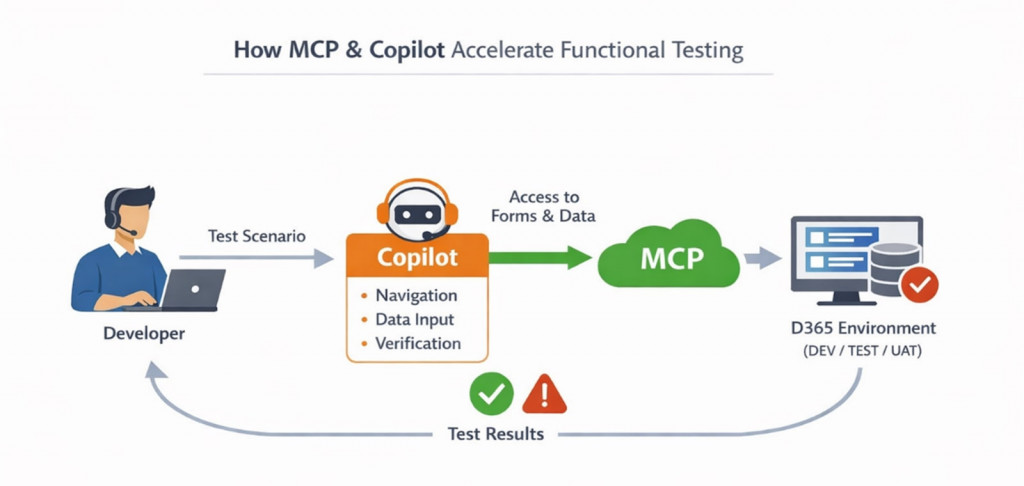 The diagram below illustrates how MCP and Copilot interact with the developer and the D365 system, making the testing process more controlled and predictable:
