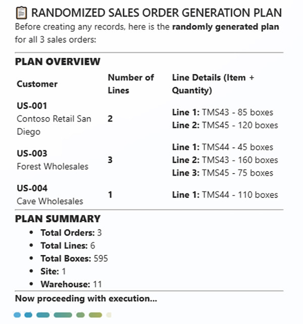 1. Use the following input data for generating sales orders:2. Before creating any records, generate a randomized plan for all 3 sales orders:3.Present the generated plan in a clear structured format:4. After the plan is generated and shown, proceed with execution: |