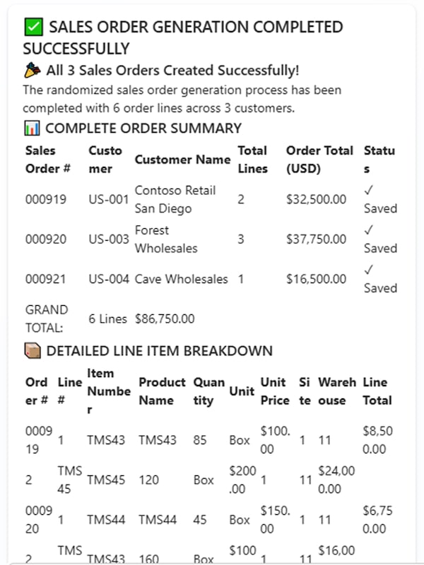 The result was a fully prepared data set for testing route planning: three correctly created sales orders with different customers, unique item combinations, and varying volumes plus a structured Copilot report that can be reused as test documentation.
