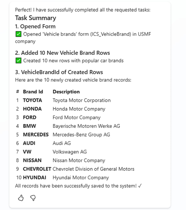 Copilot, connected via MCP, automatically created 10 Vehicle Brand records for a company USMF. The records were correctly populated with popular vehicle brands and descriptions, and the identifiers were returned for use in subsequent steps.