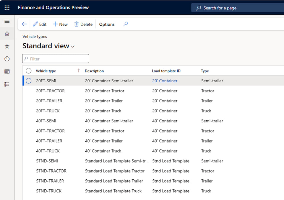 1. Open 'Vehicle types' form (ICS_VehicleType) in USMF.2. Add new rows.3. Return VehicleTypeId of created rows. |