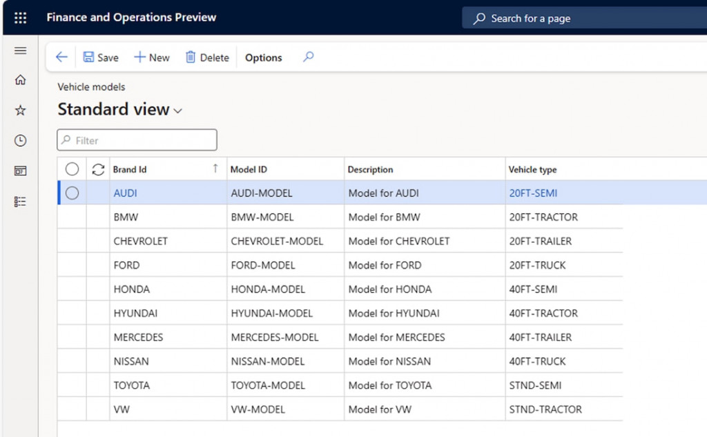 1. Open 'Vehicle models' form (ICS_VehicleModel) in USMF.2. Add new rows.3. Return VehicleModelId of created rows. |