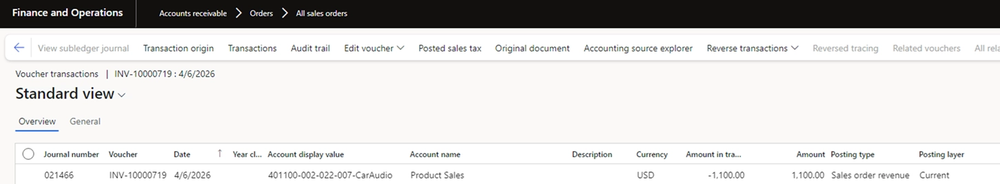 When delivery cost is included in the product price, the situation changes: delivery cost is effectively “embedded” in revenue. It is no longer treated as a separate revenue component but becomes part of the product margin. Based on the sales order invoice, the system creates a posting to the Sales order revenue account without generating a separate posting to the Freight revenue account.