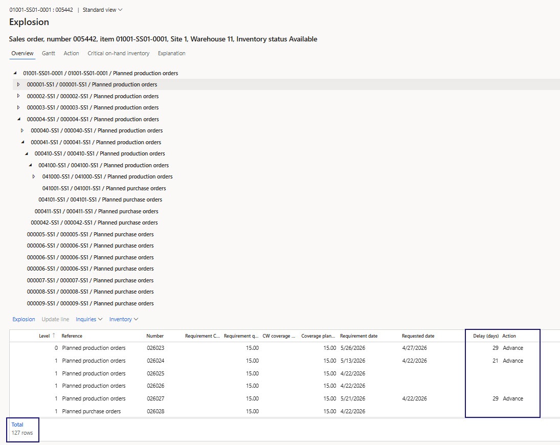 For further analysis, the user needs to navigate to the “Explosion” form, which presents a hierarchical structure reflecting all orders involved in covering demand, as well as information about each of them, including action messages and delay days.
