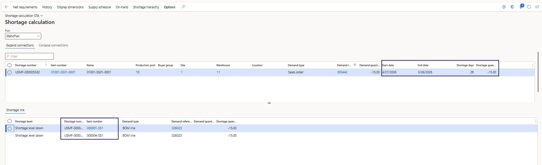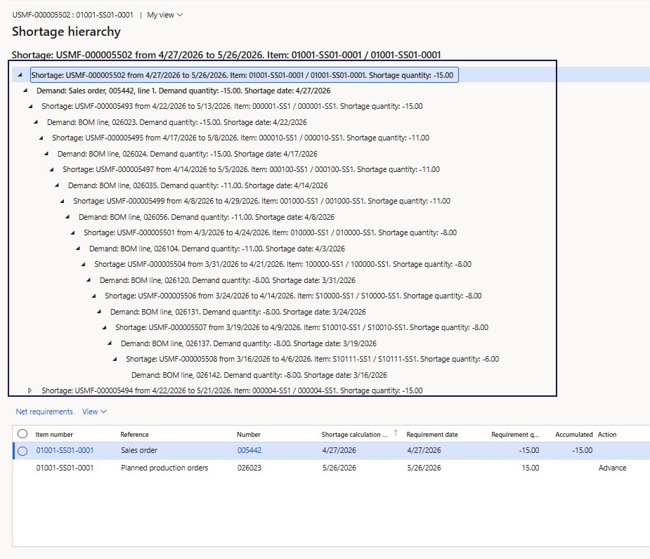 In the “Net requirements” grid, the user sees requirement transactions that are considered in shortage formation.