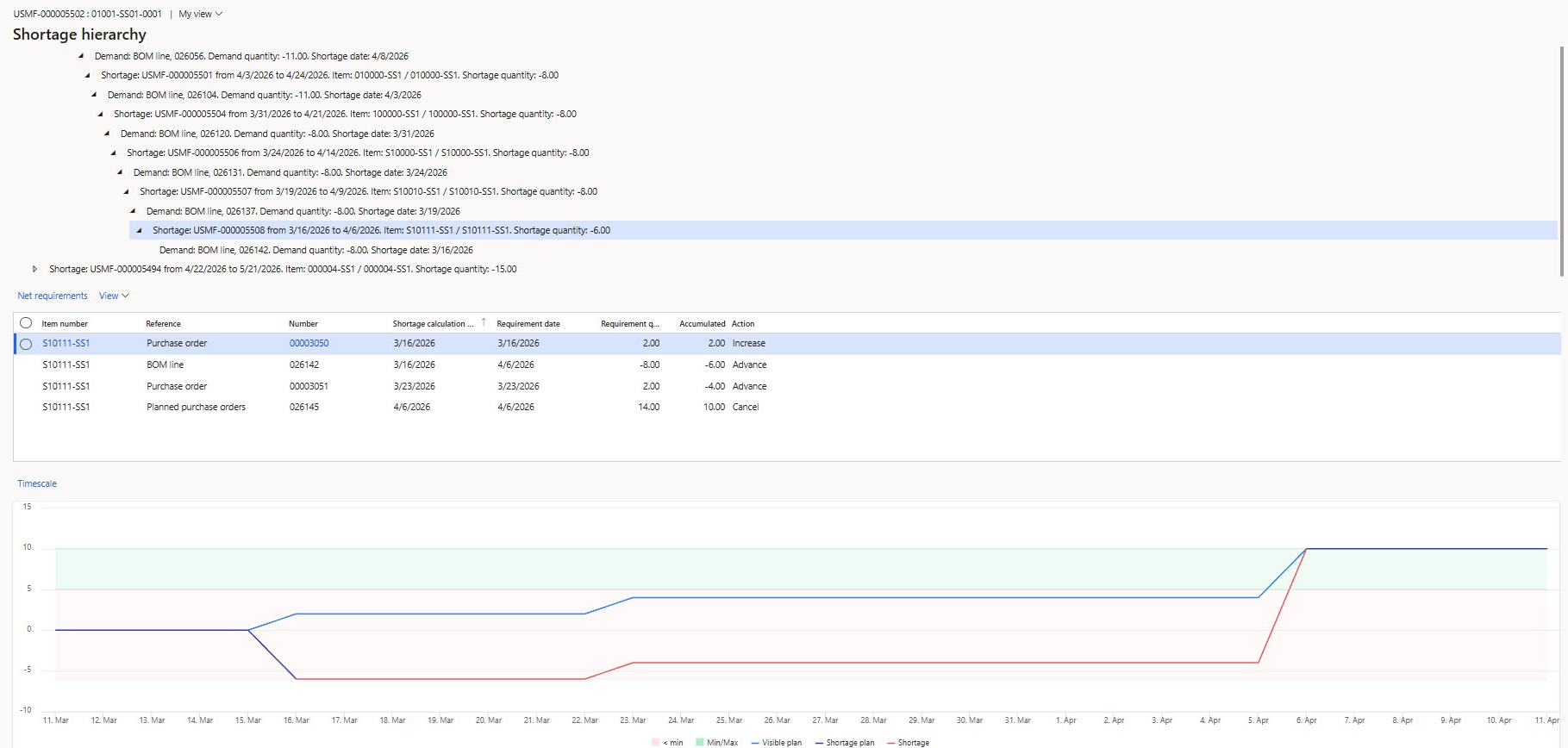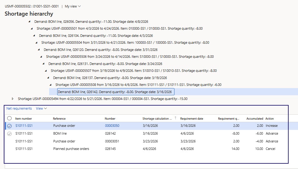 On the Shortage hierarchy form, using hierarchical structure and graphical representation, the user can quickly identify and obtain information about the actions required to eliminate the shortage.