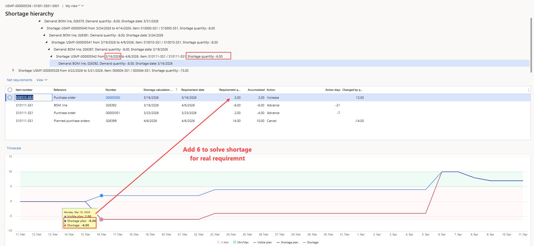 For example, for one problematic material, it can be seen on the screenshot below that to fulfill a sales order on time, it is necessary to replenish stock by 6 units before March 16.