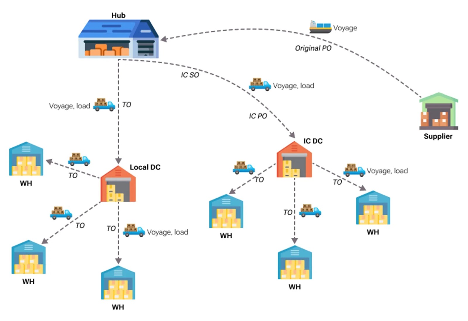 | Legal Entity with hub | Delivery from local DC to local warehouses | Transfer order | Load, Voyage | Landed costs are added to Inventory cost |