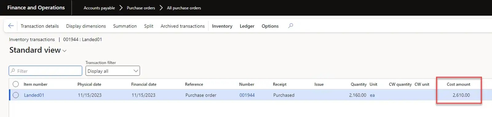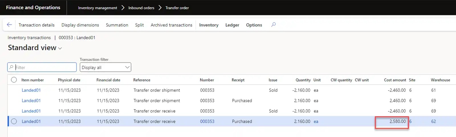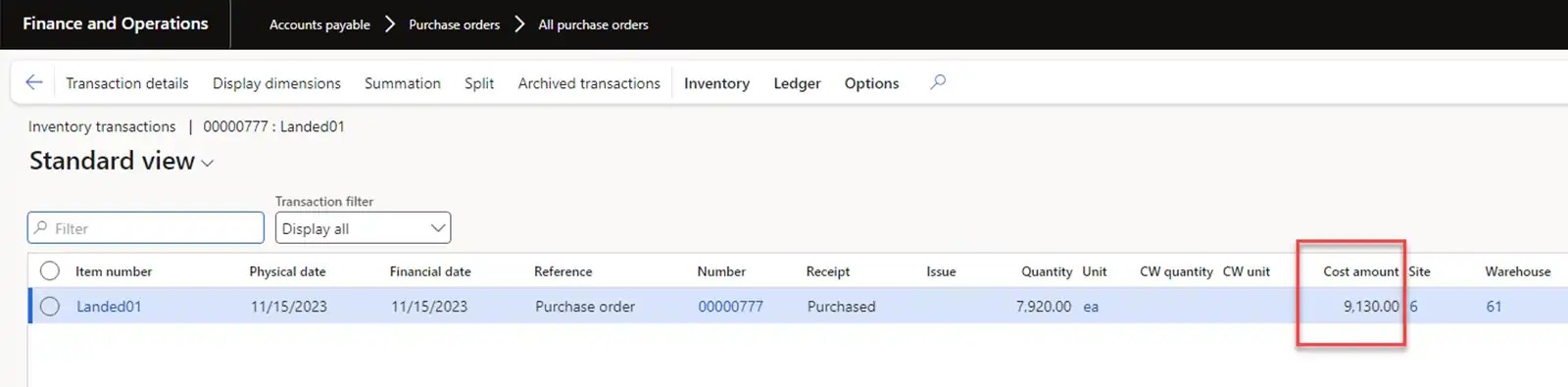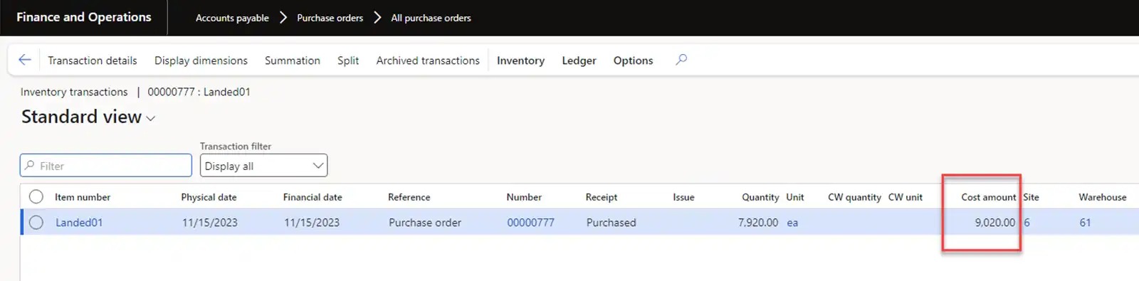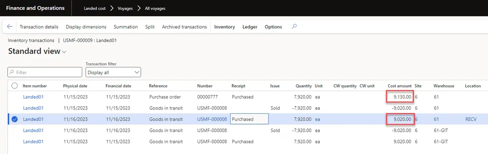 Let’s mark inventory transactions with our previously received goods from the USMF-000008 Goods-in-transit order. In this case, the inventory cost will be 820 USD.