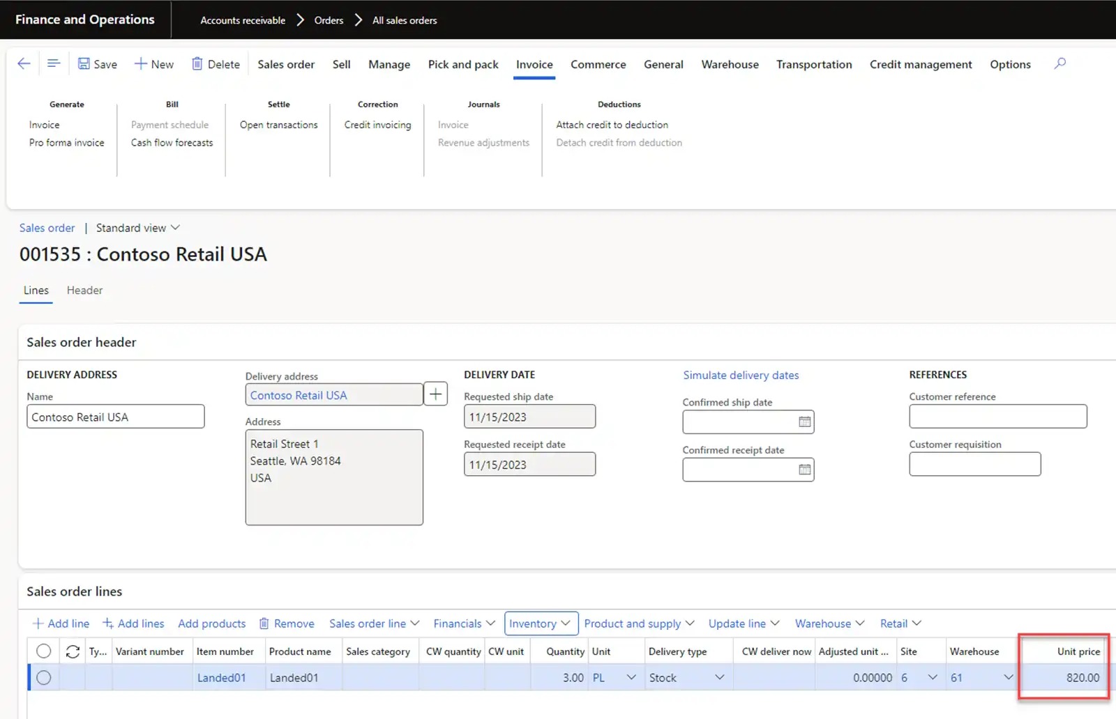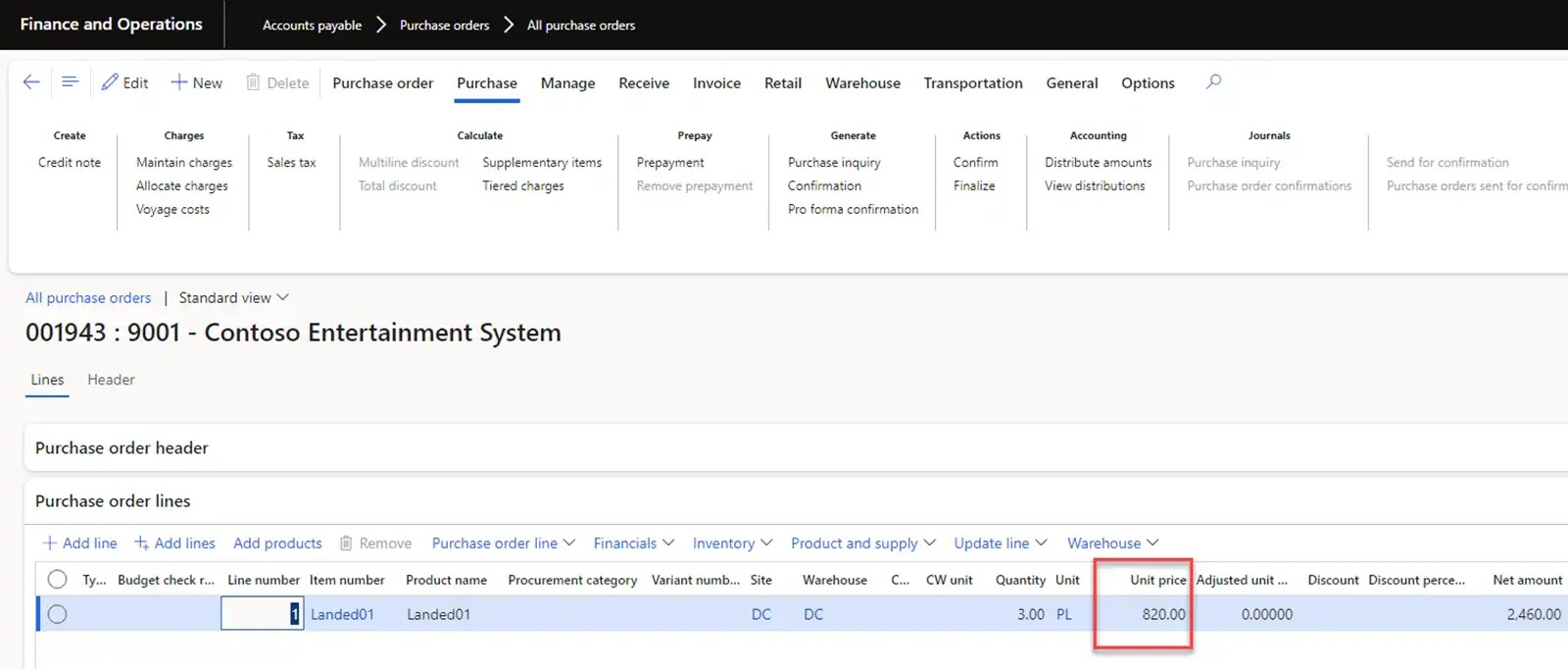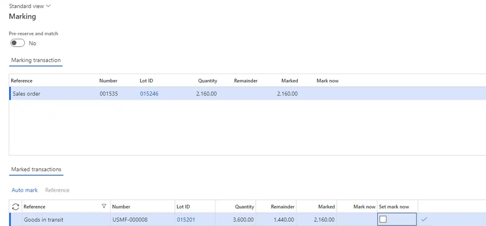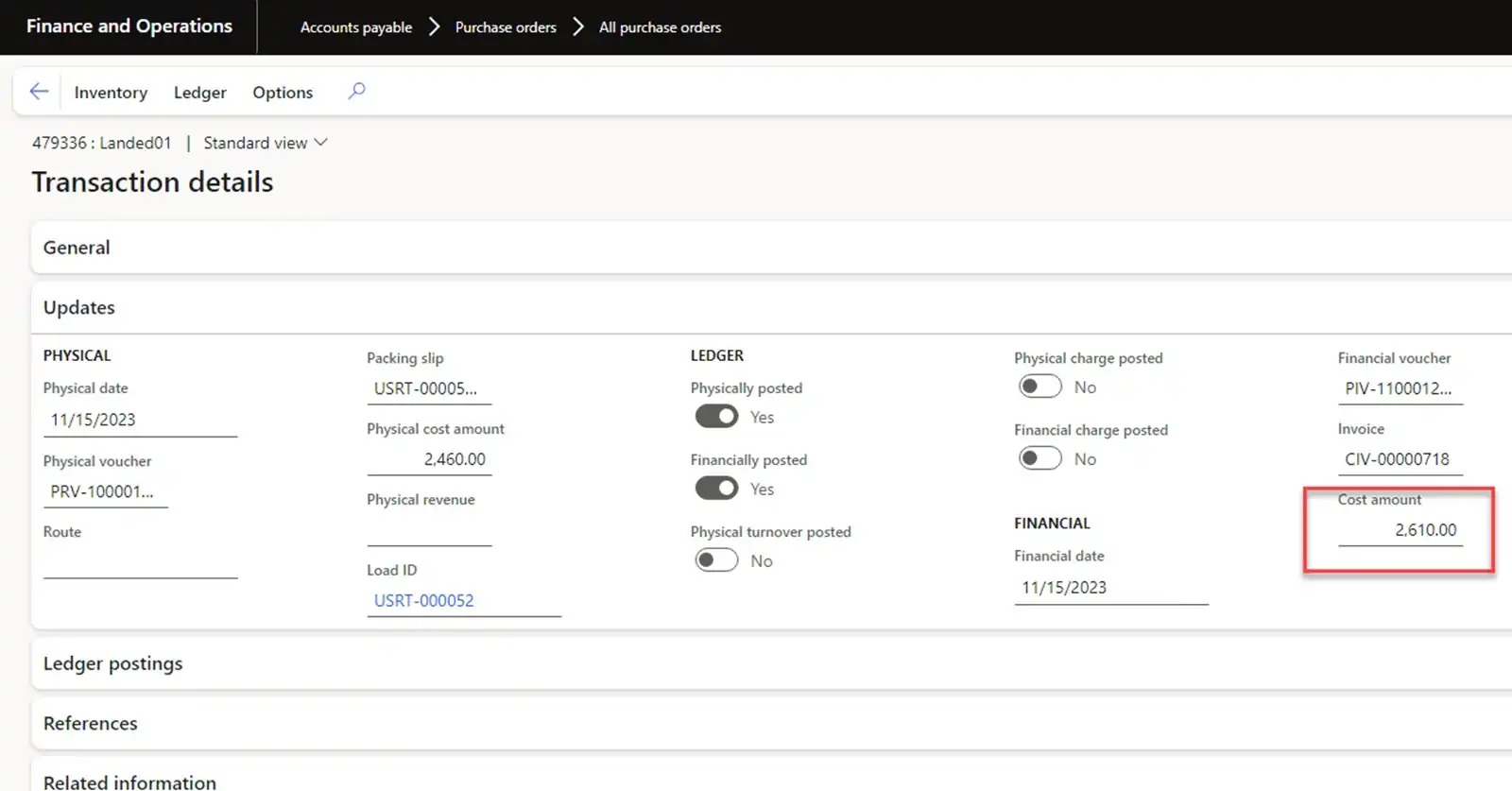 Let’s mark inventory transactions with our previously received goods from the USMF-000008 Goods-in-transit order. In this case, the inventory cost will be 820 USD.