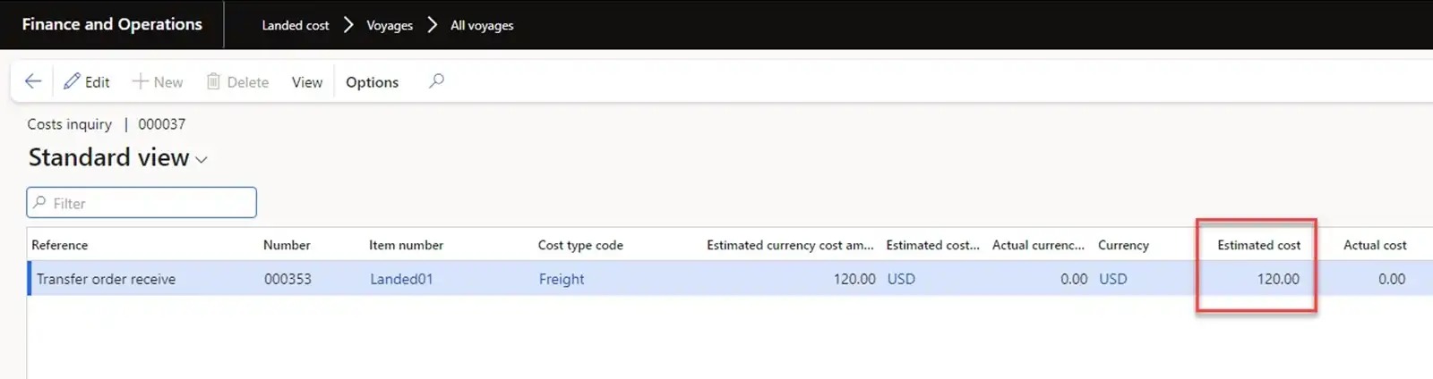 General ledger transactions can be viewed in Voyage cost of the Transfer order line. In our case, we check the “Estimate adjustments” transactions.
