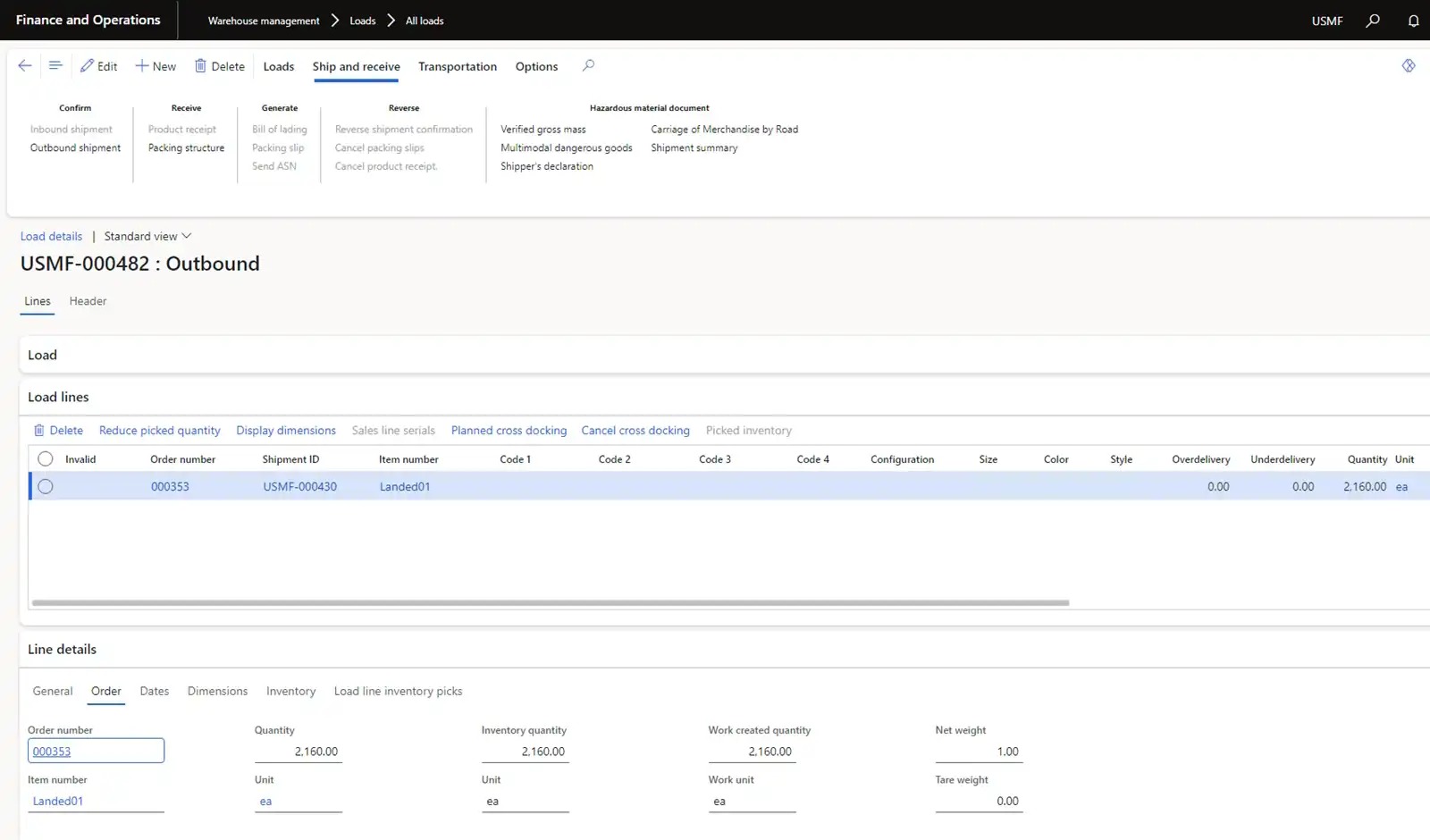 For the order line, we have also marked transactions with previously received goods from the USMF-000008 Goods-in-transit order.