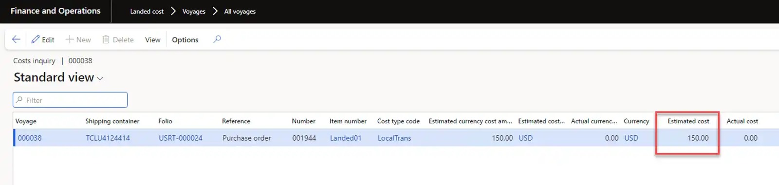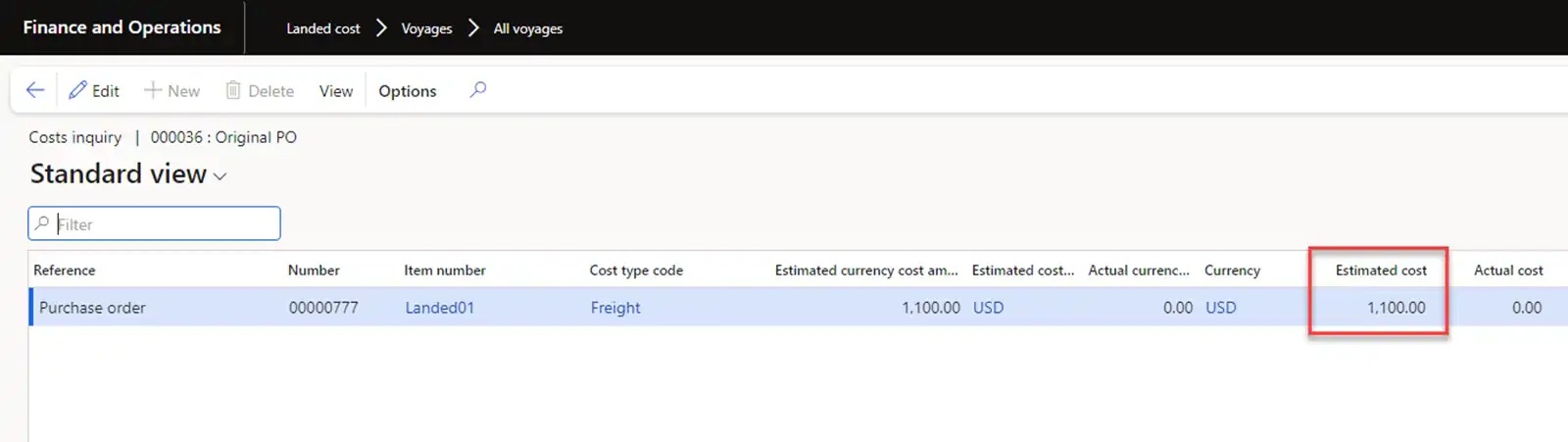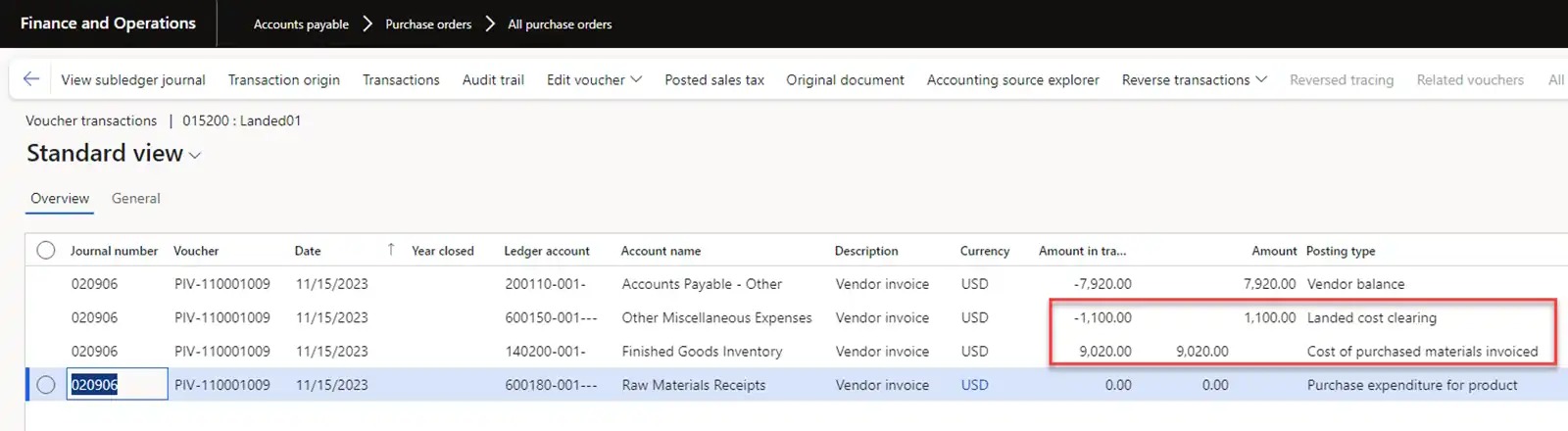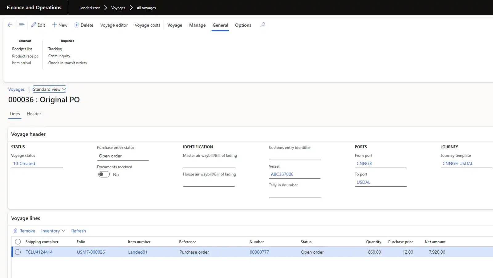 - The Landed cost module is designed to automate inbound logistics with a large list of capabilities. For our process, the module provides the ability to create Voyage for Original Purchase order, enter container information, select a route configuration with cost calculations, register the transfer of ownership of the goods in transit, register actual costs and distribute transportation costs to the cost of the goods. Also, it allows to create Voyage for Transfer orders, select a route configuration with cost calculations, distribute transportation costs to the cost of the goods.