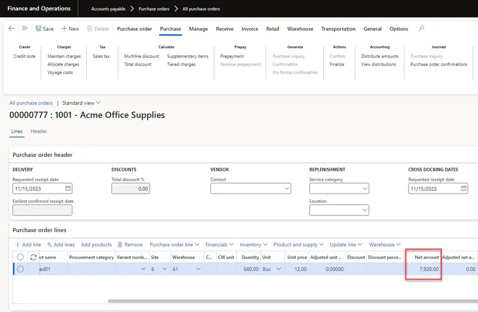 To demonstrate this scenario, let’s create an Original Purchase order for the purchase of one product with a quantity of 660 boxes (11 pallets) and net amount of 7920 USD. Sales calculation tax will be excluded to simplify calculations.