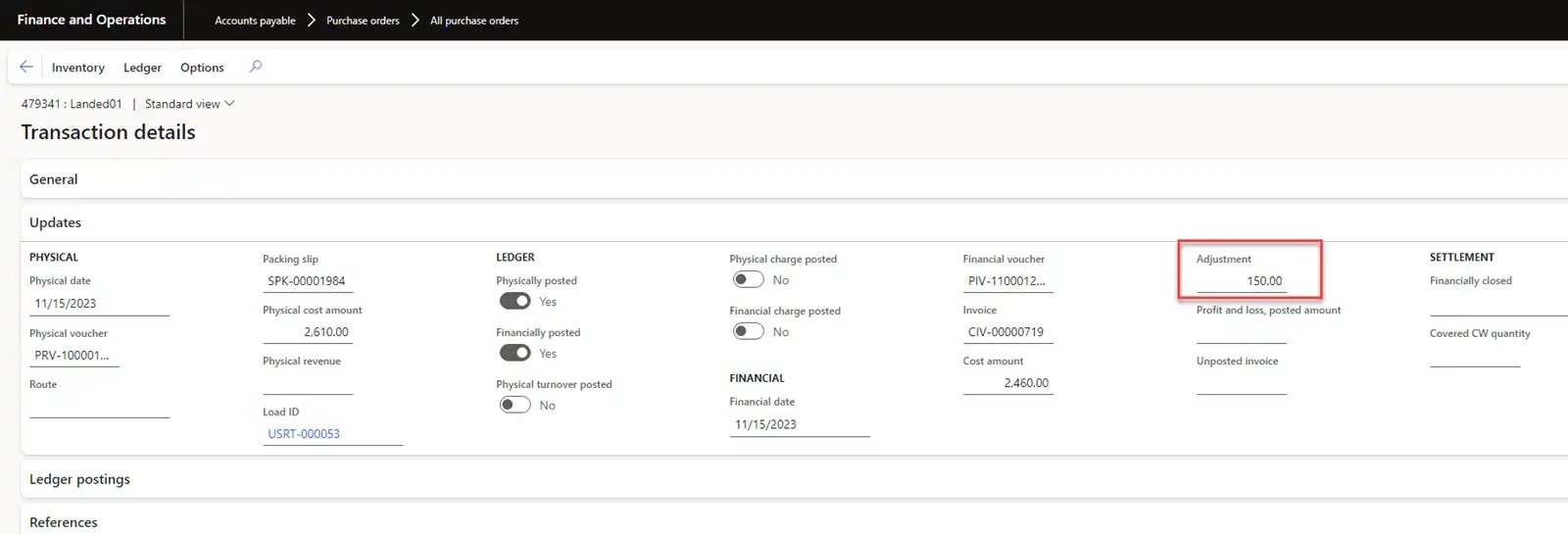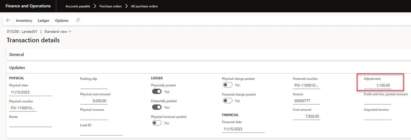 The Landed cost amount can be seen in the Adjustment field.