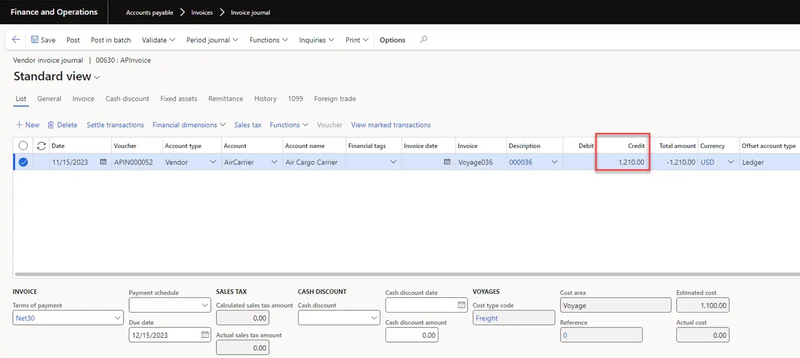 We post the freight invoice according to the actual transportation costs. For example, 1210 USD.
