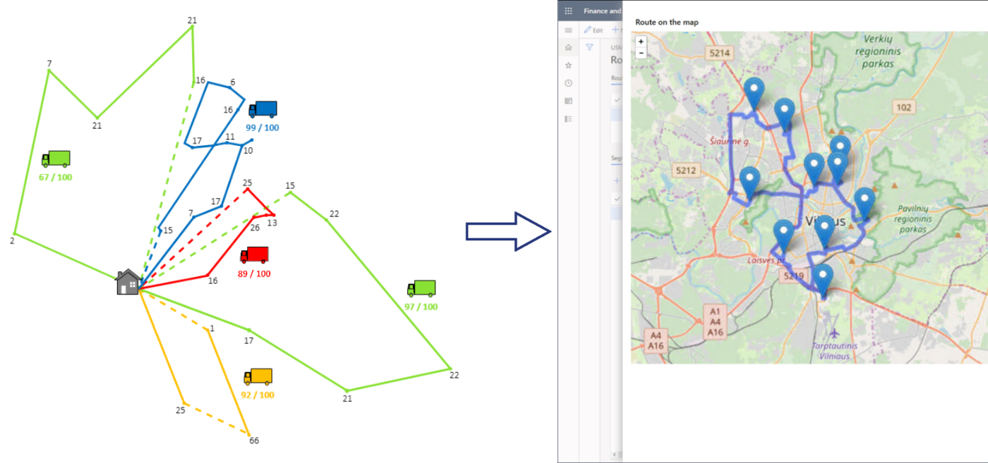 Needless to say, all this requires quite complex mathematical models and algorithms for clusters building, optimal routes calculation, carrying capacity and vehicle capacity calculations, etc., which will be covered in the upcoming articles. For now, we just show a nice picture with the final result of how it looks in AX (the route in the screenshot on the right corresponds to the blue route in the schematic diagram).
